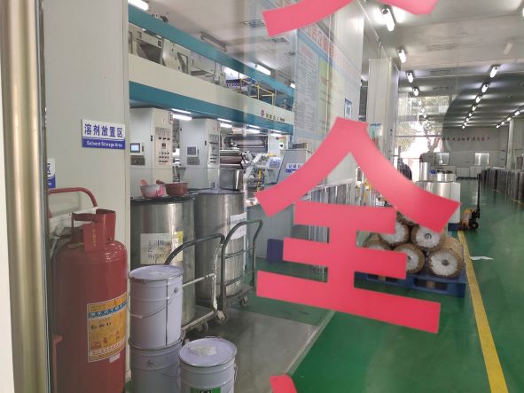 該企業在廠區南側設置建筑面積56.63㎡的危險化學品倉庫,危險化學品倉庫分為三個隔間分別存放膠水(聚氨酯粘合劑、聚氨酯膠粘劑)、凹版印刷油墨、稀釋劑(包括乙酸乙酯、乙酸丁酯、乙酸正丙酯、異丙醇)。